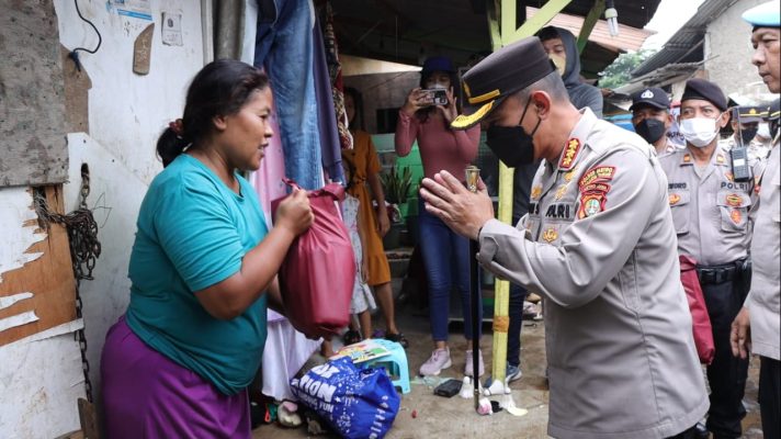 Kapolres Metro Jakarta Timur Kombes Pol Budi Sartono bagikan 100 paket sembako secara door tu door kepada warga Masyarakat lingkungan Polsek Ciracas yaitu di Rt. 011/06 Kel. Rambutan Ciracas Jakarta Timur, pada 8 September 2022.