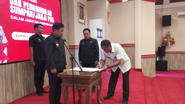 Bangli,PersIndonesia.Com- Bupati Bangli, Sang Nyoman Sedana Arta menghadiri sekaligus melakukan pelantikan dan pengambilan sumpah Pegawai Negeri Sipil (PNS) dalam Jabatan Fungsional di lingkungan Pemerintah Kabupaten (Pemkab) Bangli, bertempat di Gedung BMB pada Kamis (19/12/24).