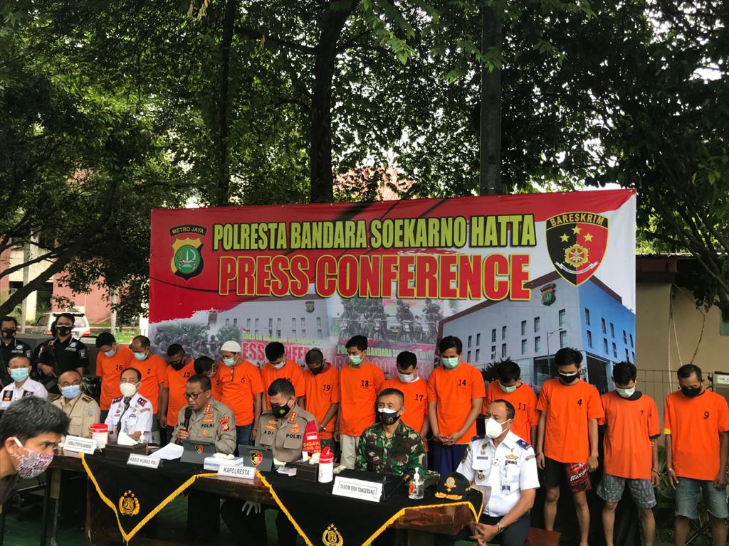 Dalam Press Release nya di Taman Integritas Polresta Bandara Soetta, Senin (18/01/2021) Pukul 09:30 Wib. Kabid Humas Polda Metro Jaya Kombes Pol Yusri Yunus Mengatakan,”Akhirnya Team Garuda Reskrim Polres Bandara Soekarno Hatta meringkus 14 tersangka Warga Negara Indonesia Berinisial, MHJ, M alias A bin MY, ZAP, DS, U alias B, AA, U alias U, YS, SB, S bin N, S alias C, IS, CY, RAS,”Ujar Kombes Pol Yusri Yunus.