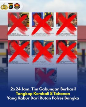 Dalam waktu 2 × 24 jam, tim gabungan berhasil menangkap kembali delapan tahanan, yang sebelumnya melarikan diri dari Rumah Tahanan (Rutan) Polres Bangka. Keberhasilan ini merupakan hasil kerja cepat dan sinergi, aparat kepolisian bersama masyarakat.