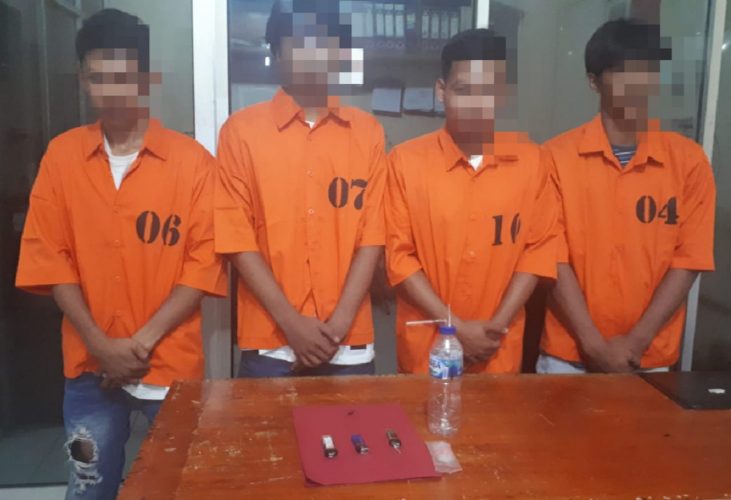 Empat tersangka lainnya yang ikut ditangkap adalah RN (20), TM (18), DS (17) dan AR (20), keempat pemuda warga Desa Sungai Putih ini ditemukan sedang berpesta narkoba bersama tersangka RS. Petugas juga mengamankan barang bukti sebuah bong alat hisap shabu, sepotong kaca pirex dan 3 buah mancis.