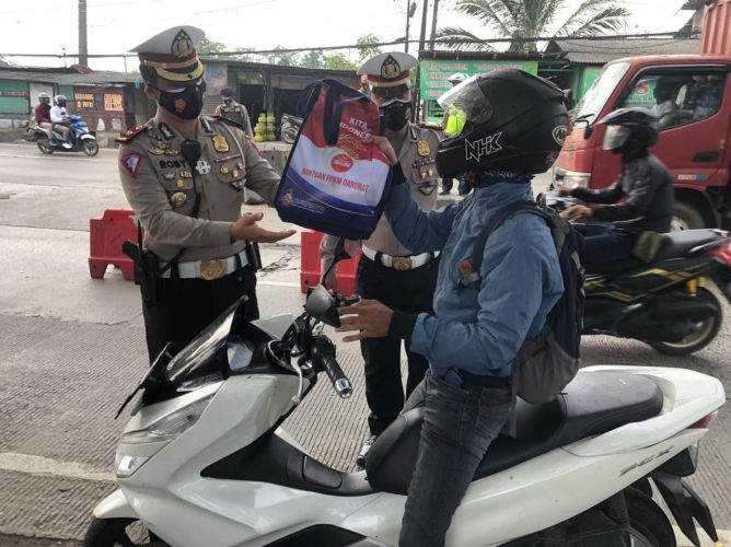 “Petugas juga membagikan bantuan sosial Pemerintah berupa sembako beras kepada masyarakat pengendara,” terang Wahyu.