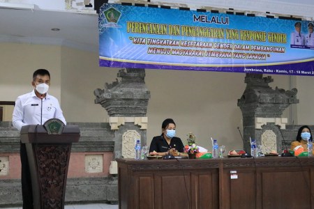 Dalam sambutannya, Wabup Patriana Krisna menjelaskan untuk mewujudkan visi kabupaten Jembrana yaitu “Mewujudkan masyarakat Jembrana Bahagia berlandaskan Tri Hita Karana”, dengan misi “Nangun Sad Kerthi Loka Jembrana”, yang mana salah satu implementasinya di masing – masing OPD diperlukan SDM yang terlatih dalam penganggaran yang responsif gender.