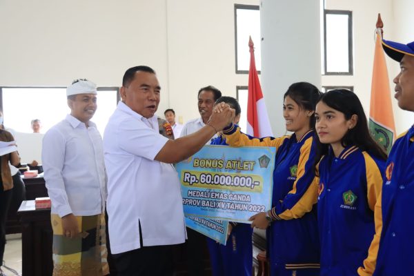 Persindonesia.com – Jembrana. Setelah berakhirnya Porprov XV 2022 lalu, Pemerintah Kabupaten Jembrna akhirnya memberikan bonus kepada para atlet berprestasi yang telah mengharumkan nama Kabupaten Jembrana. Pemberian bonus secara simbolis dilakukan oleh Bupati Jembrana I Nengah Tamba bertempat di Lantai II Gedung Ir. Soekarno, Pemkab menggelontokan anggaran senilai Rp2,6 Miliar