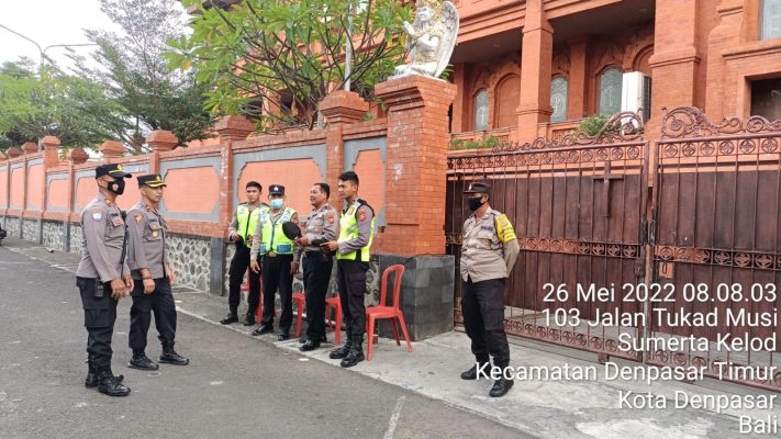terjun langsung pagi-pagi sekira jam 08 Wita ke Gereja Katedral tepatnya di Jln Tukad Musi Sumerta Kelod Dentim, guna mengecek kesiapan personil dalam melaksanakan giat keamanan sekaligus kenyamanan umat Kristiani dalam melaksanakan ibadah suci (Hari Kenaikan Isa Almasih-red) 26 Mei 2022, tim lapangan dikomado oleh Kanit Binmas Polsek Dentim Iptu Nyoman Sujana.
