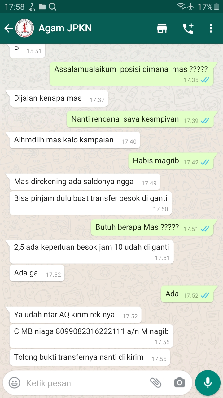 “Secara singkat, itu yang saya ceritakan kronologisnya, dan segera saya ambil tindakan mengumumkan bahwa no wa saya agar untuk segera di blokir karena telah dibajak, takut disalahgunakan mas” , ” Dan benar feeling saya, akhirnya salah satu rekan saya yang mencoba kontak akun wa tersebut, si oknum pencuri akun mulai membalas, mencoba menipu dengan menggunakan nama saya berkedok pinjam uang” ujar Agam