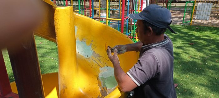 Ari mengaku, peralatan bermain anak-anak tersebut yang sudah rusak seperti bolong dan besinya patah, akan diperbaiki dengan cara menempel yang bolong dan mengelas pegangan besi yang patah. “Mudah-mudah nanti kedepan bisa sama-sama menjaga fasilitas yang sudah kita bikin, sehingga umur mainan anak-anak tersebut bisa lebih panjang. Kita tidak menempatkan penjaga disana itu merupakan fasilitas publik,” ungkapnya.