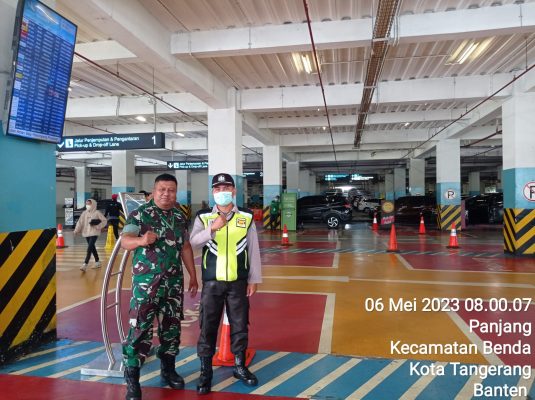 Kodam Jaya, Tangerang,Persindonesia.com – anggota Koramil 02/Btc Babinsa Neglasari Sertu Handoko Agung bersama bhabinkamtibmas melaksanakan pengamanan Bandara Soekarno Hatta, Minggu (07/05/2023).