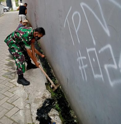 Kegiatan bersama warga melaksanakan gotong royong membersihkan saluran air di wilayah Koramil 01/Tgr.