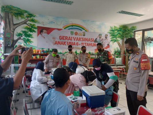 Kegiata launching serbuan vaksin di gelar di SDN Pamulang Indah Komplek Bukit Pamulang Indah Blok B 11 Kelurahan Pamulang Kota Tangsel, Rabu (15/12/2021).