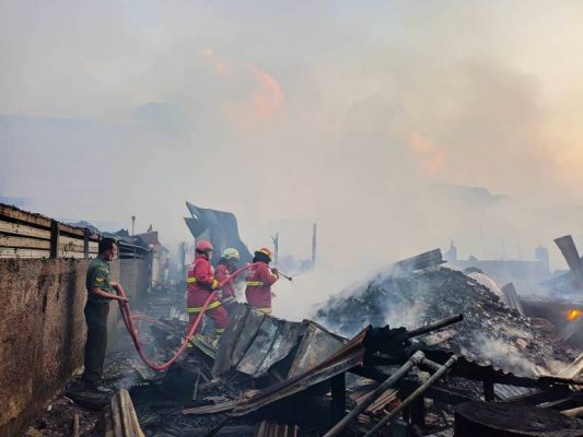 Kodam Jaya, Tangerang,Persindonesia.com – Anggota Koramil 05 Ciputat Sertu Sugeng Priyono Babinsa Kel Cipayung berjibaku bersama petugas Damkar Tangsel memadamkan kobaran api yang menghanguskan puluhan kios di pasar Ciputat , Kel Cipayung, Kec Ciutat, Tangerang Selatan, Rabu (11/05/2022) sekitar pukul 16.14 WIB