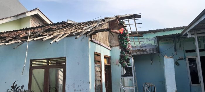 Kodam Jaya, Tangerang,Persindonesia.com –  Dukung program Pemerintah melalui Bedah Rumah Tidak Layak Huni (RTLH)  khususnya bagi masyarakat tidak mampu, Babinsa Kel Benda Baru Serma Siregar dan Serda Heryana Koramil 08/Pamulang, Kodim 0506/Tangerang bergotong royong bersama warga binaan saat bedah rumah salah satu warga binaannya.