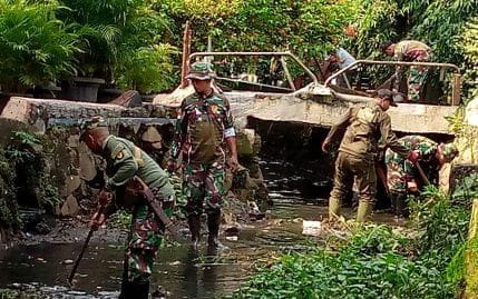 Dengan penuh semangat gotong royong dan kebersamaan, Babinsa Koramil 04/Ciledug bersama warga membersihkan sampah/kotoran yang ada di dalam saluran air di kiri dan kanan sepanjang jalan.
