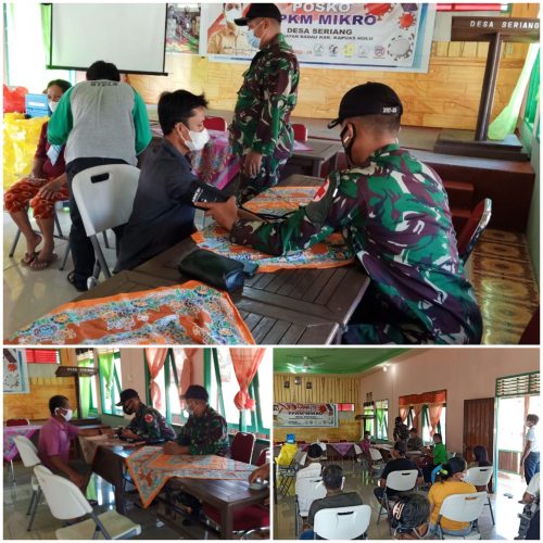 Serka Jumali dari Pos Seriang SSK 1 ini bersama personel Satgas lainnya membantu kegiatan vaksinasi ini, mulai dari tensi dan mengatur antrian, sehingga berjalan dengan tertib dan lancar. (Dispenad)