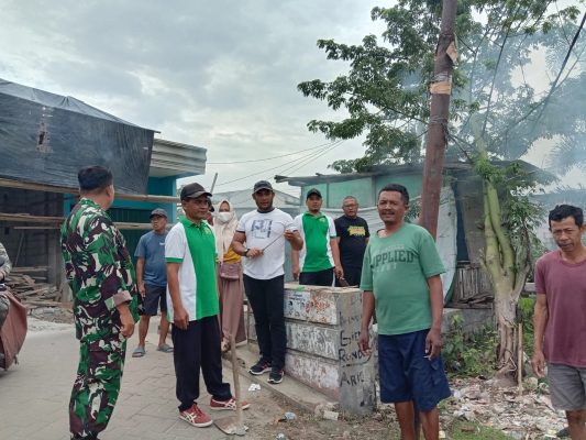 Terlihat Babinsa Sertu Salekan, Sertu Indra Binamas, 2 orang staf Kelurahan Cipete dan warga kompak bergotong royong membersihkan sampah di lingkungan.