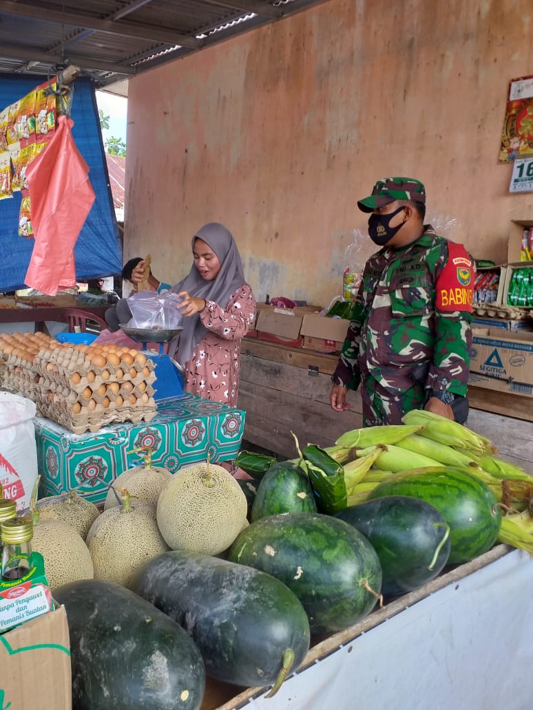 MEMBALONG — Personel Koramil 414 -04 / Membalong Sertu Suendi turun ke pasar tradisional di Kecamatan Membalong untuk mengecek harga bahan pokok dalam rangka bulan Suci Romadhon ,Sabtu 17/04/2021.