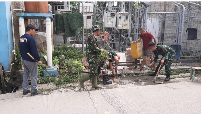 Babinsa dan Binamas serta warga masyarakat bergotong royong, kerja bakti membersihkan lingkungan dan selokan air yang dapat mengakibatkan timbulnya wabah penyakit dan banjir.