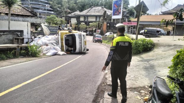PersIndonesia.Com,Bangli- Sebuah Truck Isuzu berwarna kuning dengan Nopol L 8533 UP yang bermuatan pupuk sekam terguling di jalan raya jurusan Penelokan – Suter, tepatnya di Timur Simpang Tiga Geopark Desa Kedisan, Kecamatan Kintamani, Kabupaten Bangli, Selasa (20/5/2025) yang menyebabkan arus lalu lintas sempat tersendat.