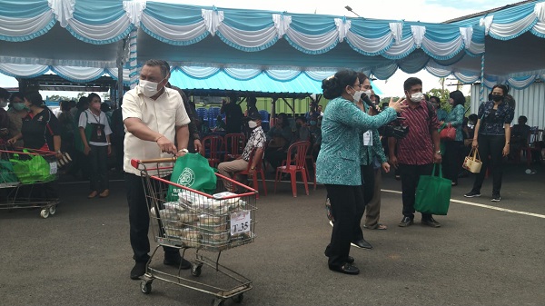 Terlihat Ketua TP PKK Prov. Bali Ny. Putri Suastini Koster beserta anggota PKK se Bali memborong hasil pertanian yang dijual di Pasar Rakyat tersebut dan kembali di berikan kepada masyarakat yang terdampak pandemi Covid-19.