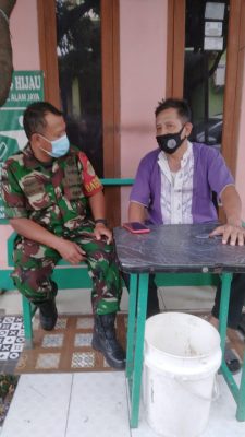Komsos Serda Darkoni bersama-sama dengan warga Kelurahan Alam Jaya mengingatkan warga harus tetap menjalankan protokol kesehatan, karena masih adanya penularan Covid- 19.