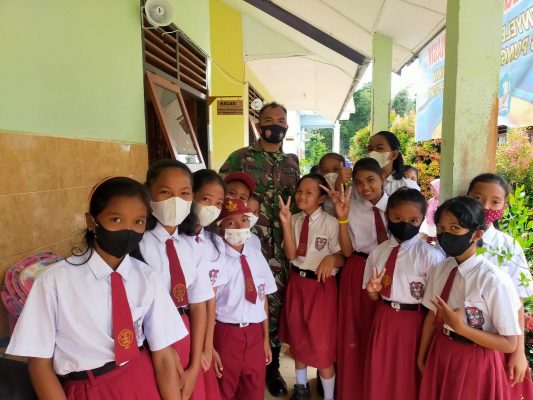 Pada pelaksanaan kegiatan ini Sertu Yudisen menyampaikan kepada siswa-siswi SD walaupun sudah divaksin agar tetap mengikuti peotokol kesehatan.