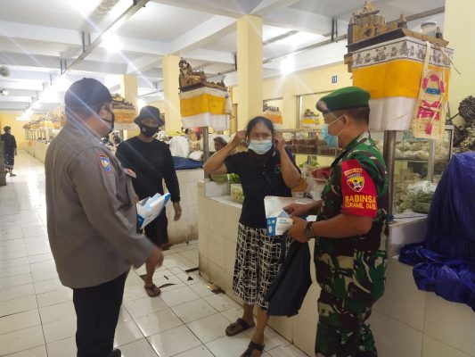 Gianyar (persindonesia.com) – Babinsa Koramil 1616-04/Blahbatuh bersinergi dengan Bhabinkamtibmas Keramas melaksanakan Prokes di pasar adat Keramas. Kamis. (10/2/22).