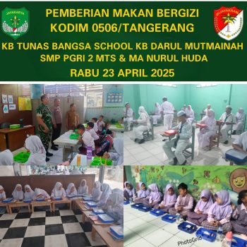 Kodam Jaya, Tangerang,Persindonesia.com- Upaya mendukung program Pemerintah personil Koramil 01/Tgr, Kodim 0506/Tgr melaksanakan kegiatan Monitoring Makan Bergizi Gratis (MBG) untuk anak-anak sekolah tingkat Kelompok Belajar (KB), SD, SMP dan MTS di wilayah teritorial Koramil 01/Tgr, Rabu (23/04/2025).