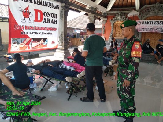 KLUNGKUNG-PersIndonesia.Com- Perkumpulan Pecalang Jagabaya Dulang Mangap Kabupaten Klungkung melaksanakan aksi sosial Donor Darah di Balai Banjar Adat Negari, Dusun Negari, Desa Negari, Kecamatan Banjarangkan, Kabupaten Klungkung. Dalam pelaksanaan kegiatan dihadiri Perbekel Negari, I Gusti Bagus Mahendra didampingi Babinsa Negari, Serka I Gede Adiasa bersama Bhabinkamtibmas, Minggu (7/4).