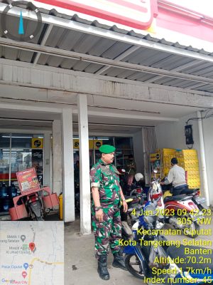 Kodam Jaya, Tangerang,Persindonesia.com – Menjaga Kamtibmas Babinsa Serua Indah Koramil 05/Ciputat, Kodim 0506/Tgr Serda Muhadi melakukan Komsos langsung dengan warga binaan di depan pusat belanjaan Alpamart wilayah Kelurahan Serua Indah Kecamatan Ciputat Kota Tangsel, Rabu (04/01/2023).