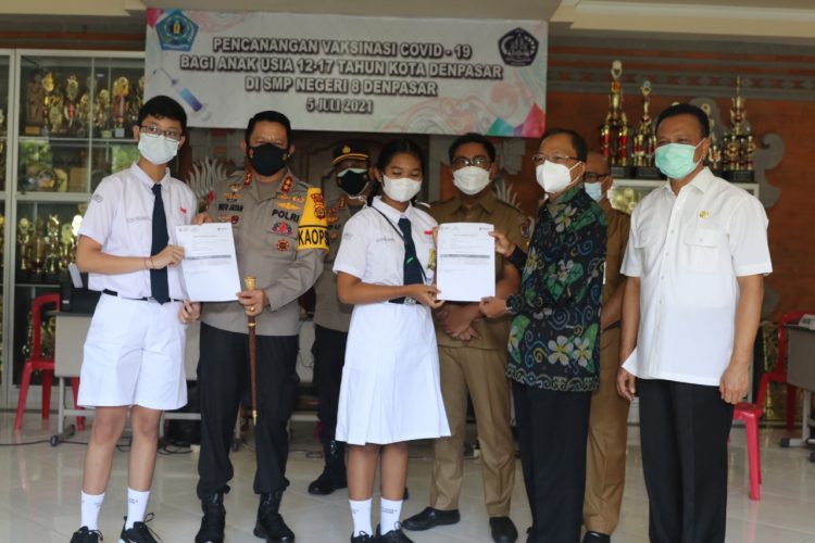 “ Targetnya paling lambat sampai 10 Juli 2021, semua anak-anak smp dan sma yang berusia 12-17 tahun sudah semuanya di vaksinasi, dan tidak lupa saya sampaikan ucapkan terimakasih kepada tenaga vaksinator dari dinak kesehatan provinsi bali dan tenaga kesehatan dari Polda Bali yang membantu dalam terselenggaranya vaksinasi covid-19 serentak ini “, ucapnya.