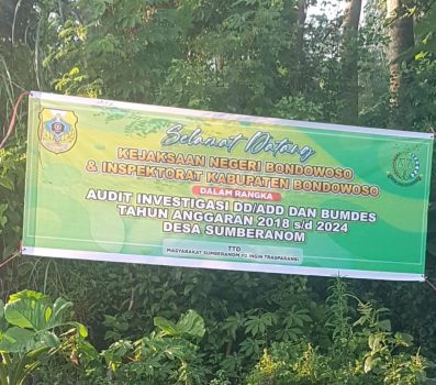 Persindonesia.com Bondowoso — Pagi ini, warga Desa Sumber Anom, Kecamatan Tamanan, dikejutkan oleh kemunculan sebuah banner tak biasa di pertigaan jalan desa. Banner tersebut bertuliskan ucapan selamat datang untuk Kejaksaan Negeri Bondowoso dan Inspektorat Kabupaten Bondowoso yang tengah melakukan audit investigasi terhadap Dana Desa (DD), Alokasi Dana Desa (ADD), dan Badan Usaha Milik Desa (Bumdes) untuk tahun anggaran 2018 hingga 2023.