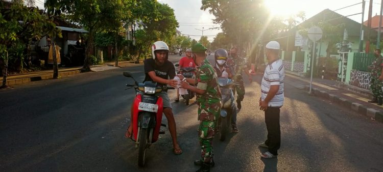 Tampak personel Kodim 1617/Jembrana dipimpin Pasi Inteldim 1617/Jembrana Lettu Czi Ida Made Putra menghentikan kendaraan yang melintas di Jalan Ngurah Rai tepatnya di depan Makodim 1617/Jembrana. Pengendara maupun masyarakat terlihat antusias menerima paket takjil yang diberikan oleh personel Kodim 1617/Jembrana, Sabtu (30/04/2022)