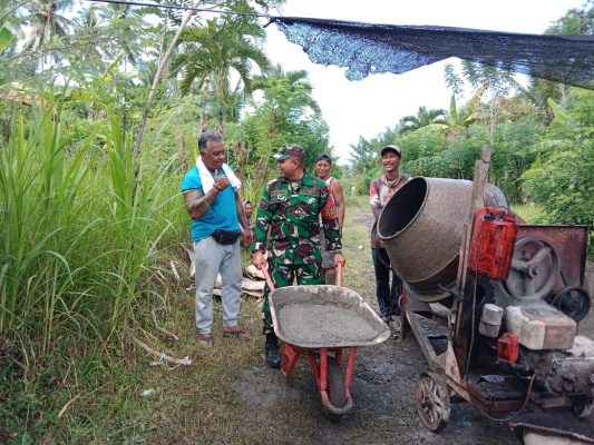 Persindonesia.com Jembrana, Wujud kepedulian TNI terhadap kesulitan yang dihadapi rakyat disekelilingnya ditunjukan oleh Babinsa Candikusuma, Koramil 1617-03/Melaya Serka Dewa Budiwilantara. Berbaur bersama sama warga binaan Serka Dewa Budiwilantara turut mengikuti kegiatan gotong royong rabat beton jalan aspal yang rusak secara swadaya oleh masyarakat setempat, di Jalan Desa Banjar Moding Kaja, Desa Candikusuma, Kec.