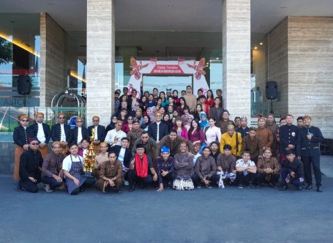 halaman lobby hotel dengan diikuti manajemen dan seluruh staf yang mengenakan busana adat Jawa.