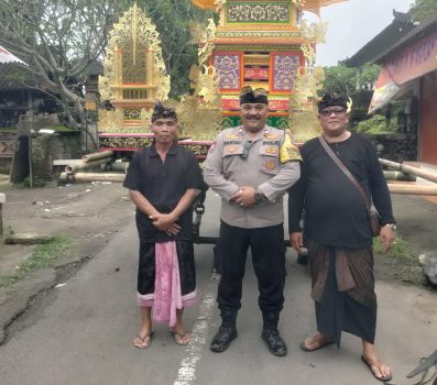 Polsek Ubud – Bhabinkamtibmas Desa Singakerta Aiptu I Made Widastra Bersinergi Dengan Pecalang Melaksanakan pengamanan Upacara Ngaben Almarhum Ida Ayu Kompyang Warga Banjar Batuh, Desa Singakerta, Kecamatan Ubud, Kabupaten Gianyar.