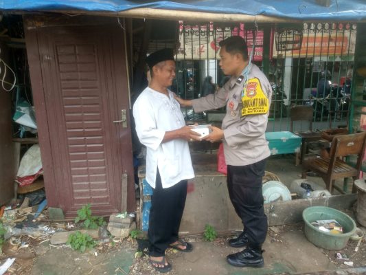 Sambil sambang, Bhabinkamtibmas Kel. Palmeriam Polsek Matraman Aipda Erwin Kurniawan memberikan bantuan makan siang kepada Pak Mahmud (seorang lansia).