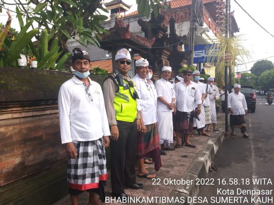 Hal tersebut dilakukan Bhabinkamtibmas Desa Sumerta Kauh Aiptu I Putu Sujana melaksanakan pengamanan Kegiatan Upacara Piodalan Saniscara Watugunung Ring Pura Pauman di jalan Ratna, Banjar Pagan Kaja, Desa Sumerta Kauh Denpasar Timur (Dentim), Sabtu (22/10/22) Sore.