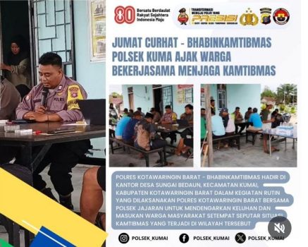 Kumai persindonesia.com – Bhabinkamtibmas hadir di kantor desa Sungai Bedaun, kecamatan Kumai, kabupaten Kotawaringin Barat dalam kegiatan rutin yang dilaksanakan Polres Kotawaringin Barat bersama Polsek jajaran untuk mendengarkan keluhan dan masukan warga masyarakat setempat seputar situasi kamtibmas yang terjadi di wilayah tersebut. Jumat (22/08/2025) Pagi