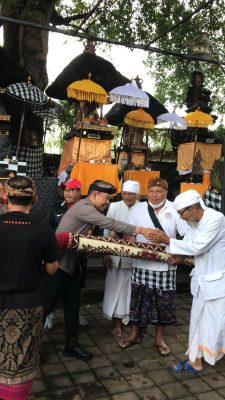 Pada kesempatan tersebut pula, Kapolsek Denpasar Utara beserta Anggota Polsek Denpasar Utara, sembahyang bersama di Pura Swagina Taman Sari, dan menyerahkan sarana kontak berupa Karpet dan Dupa kepada Pengempon Pura Swagina Taman Sari, “Terima kasih dan kami mohon untuk tetap bersama Polri”, tutup Iptu Carlos.