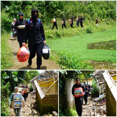 Persindonesia.com Cianjur, Menembus lokasi terpencil pengungsian gempa Cianjur, personel Brimob dipimpin IPTU dr. Haikal Mansyur belusukan bagikan bantuan dari Ibu-Ibu Bhayangkari Brimob Kelapadua Depok.