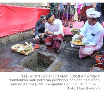 BADUNG – Pemerintah Kabupaten Badung resmi memulai pembangunan dan perluasan Gedung Kantor DPRD Badung dengan ditandai peletakan batu pertama (groundbreaking) oleh Bupati I Wayan Adi Arnawa, Senin (16/6) di kawasan Pusat Pemerintahan Kabupaten Badung.