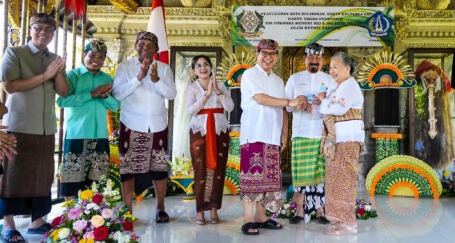 Badung persindonesia.com , 13 September 2025 — Bertempat di Puri Ageng Mengwi, Bupati Badung I Wayan Adi Arnawa secara langsung menyerahkan dokumen kependudukan berupa KTP, Kartu Keluarga, dan Akta Kelahiran kepada Ida Cokorda Mengwi XIII, Sabtu (13/09). Penyerahan ini merupakan tindak lanjut dari pengesahan identitas baru secara hukum setelah prosesi Abhiseka yang menandai penobatan sebagai Penglingsir Puri Ageng Mengwi.