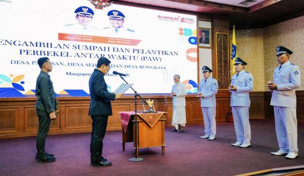 Badung Persindonesia.com – Bupati Badung, I Wayan Adi Arnawa, resmi melantik tiga Perbekel Antar Waktu (PAW) dari Desa Pangsan, Desa Sedang, dan Desa Bongkasa pada Selasa (31/03/2026) di Ruang Kertha Gosana, Puspem Badung. Pelantikan ini dihadiri Ketua DPRD Badung, I Gusti Anom Gumanti, Wakil Ketua Komisi I, para Camat, pejabat OPD, serta unsur masyarakat dan organisasi kewanitaan di wilayah Badung.