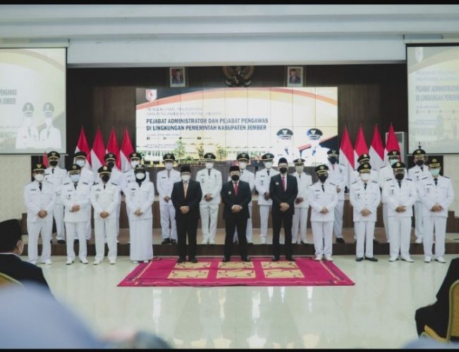 JEMBER, PersIndonesia – Bupati Jember Ir. H. Hendy Siswanto melantik pejabat administrator dan pengawas di lingkungan Pemerintah Kabupaten Jember. Pada kesempatan kali ini, Hendy Siswanto melantik, dan diambil sumpahnya sebanyak 132 orang pejabat, dengan rincian 77 pejabat administrator dan 55 pejabat pengawas, Jumat (20/08/2021).