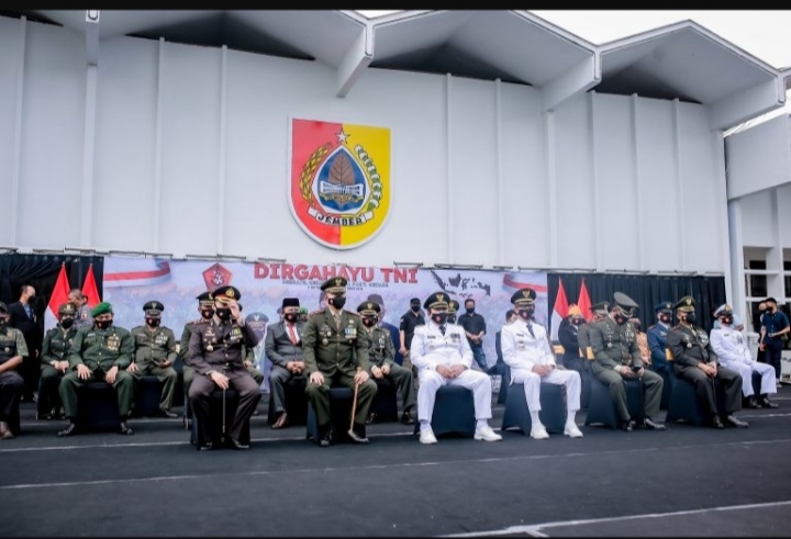 JEMBER, PersIndonesia – Bupati Jember, Ir. H. Hendy Siswanto, Wakil Bupati Jember KH. MB. Firjaun Barlaman, Beberapa Jajaran Petinggi Satuan TNI di Jember serta Kapolres Jember mengikuti secara daring upacara peringatan Hari Ulang Tahun ke 76 Tentara Nasional Indonesia yang dipimpin oleh Presiden Republik Indonesia, Ir. H. Joko Widodo di Istana Negara, Selasa (05/10/2021).