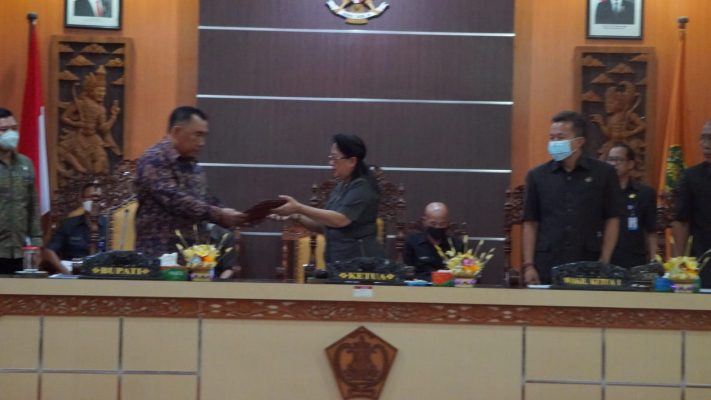 Persindonesia.com Jembrana – Rapat paripurna VI DPRD Kabupaten Jembrana masa persidangan III Tahun sidang 2021/2022 berlangsung di ruang sidang utama DPRD Jembrana, mengagendakan Penjelasan Bupati terkait 2 (dua) Rancangan Peraturan Daerah (Ranperda). Adapun dua Ranperda tersebut diantaranya yakni Ranperda tentang Penyertaan Modal Daerah Pada Perusahaan Umum Daerah Tribhuwana dan Ranperda tentang Perubahan Atas Peraturan Daerah Nomor 10 Tahun 2016 Tentang Pembentukan Dan Susunan Perangkat Daerah. Selasa (26/7/2022)