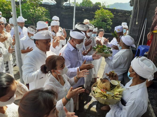 Prosesi pelantikan (mejaya jaya) dilakukan Ida Rsi Agung Wayahan Suta Dharma Jaya Giri di Pura Kawitan Pangeran Tangkas Kori Agung, Desa Tangkas, Klungkung pada Kamis, (24/6/21).