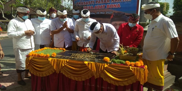 Persindonesia.com Gianyar – Bupati Gianyar I Made Agus Mahayastra menandatangani prasasti pasar rakyat Desa Adat Bona, Rabu (5/5).  Bupati Mahayastra meresmikan pasar yang telah selesai pembangunannya tersebut dengan didampingi Ketua Fraksi PDIP Kabupaten Gianyar, Anggota DPRD Kabupaten Gianyar Dapil Kecamatan Blahbatuh, Sekretaris Daerah Kabupaten Gianyar I Made Gede Wisnu Wijaya, Staf Ahli Kabupaten Gianyar, Kepala Organisasi Perangkat Daerah di lingkup Kabupaten Gianyar, Camat Blahbatuh, serta Perbekel Desa Adat Bona I Gusti Nyoman Gede Susila.