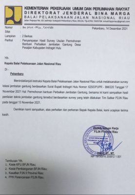Gerak cepat, langsung mengirim surat permohonan perbaikan kepada Kepala P2JN melalui surat usulan Bupati Inhu Nomor : 620/DPUPR- BM/2020, tertanggal 17 November 2021.