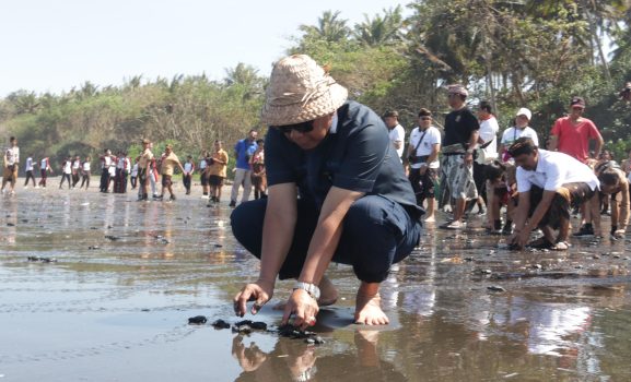 Persindonesia.com Jembrana – Bupati Jembrana I Nengah Tamba bersama sejumlah pejabat Pemkab Jembrana, melepas anak penyu/tukik jenis Lekang dan penyu sisik di Kelompok Pelestari Penyu (KPP) Jagat Kerthi, Desa Pekutatan, Kecamatan Pekutatan, Jembrana, Jumat (23/10).